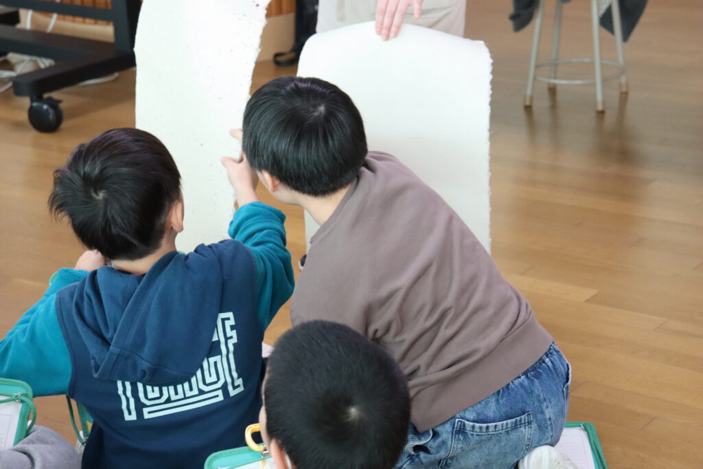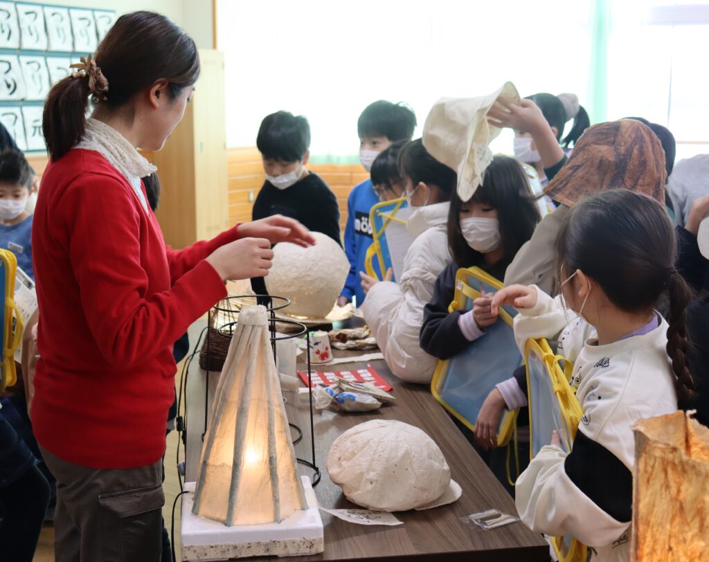 「十文字和紙愛好会」会員の方をゲストティチャーとして、3年生・4年生が、十文字和紙について学びました。原材料である楮や十文字和紙を使ったランプ・照明器具などの実物に触れながら、工程や伝統を受け継いでいる方々の思いなどを知ることができました。子どもたちの中には、冬季休業中、地区の交流センターにおいて、和紙を使った工作に取り組む予定の子もいて、いっそう楽しみになったようでした。自分たちの地域に古くから伝わる手作り和紙の良さに触れ、自分もまたそれを大切にしていこ うという気持ちをもつことにつながりました。