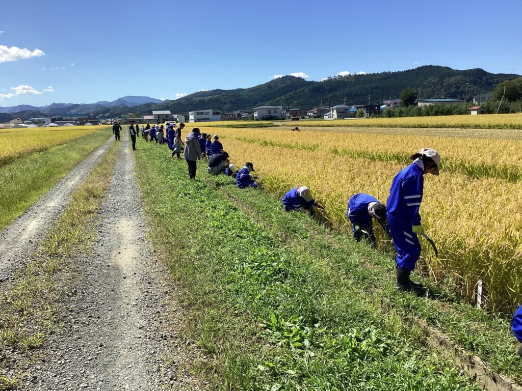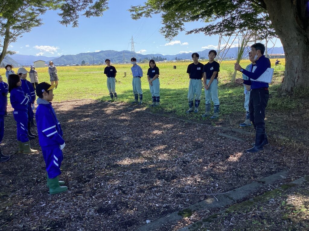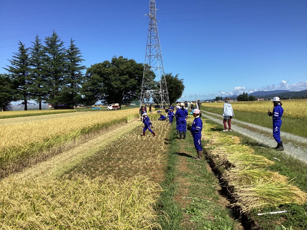 9月22日(月)、5年生が総合的な学習の時間の授業で稲刈り体験をしました。これは、4月に自分たちで手植えした苗が夏の厳しい暑さを乗り越えて順調に生長し、収穫期を迎えたもの。春の種まきからお世話になっている増田高校のお兄さんやお姉さんのご指導を受けて手際よく刈り取ることができました。