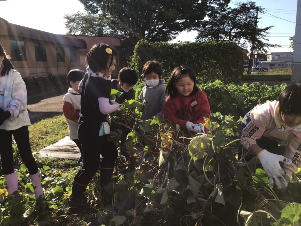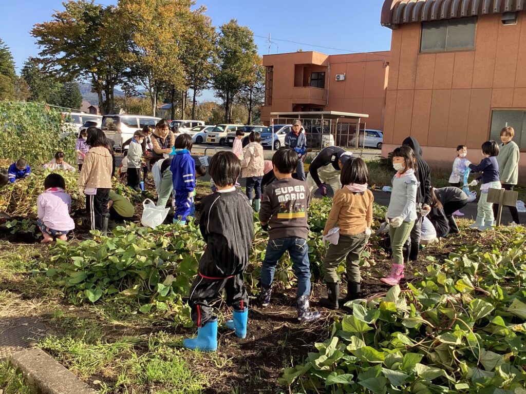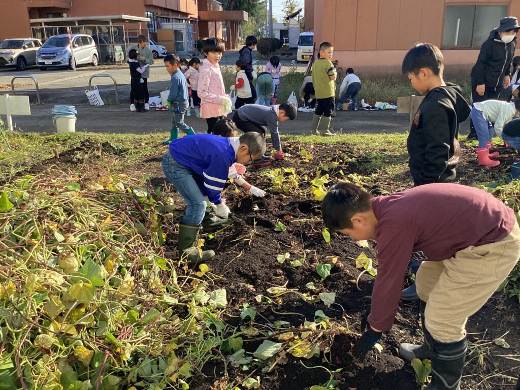 10月30日(木)、1・2年生がサツマイモ掘りをしました。夏場には、あまりの暑さに葉が枯れてしまい、そんなに実がなっていないかもしれない・・・と心配していたのですが、いざ掘り起こしてみると大収穫。次々と大きいサツマイモが掘り出され、子どもたちからは歓声があがりました。中には両手に持ちきれないほど大きいサツマイモもありました。子どもたちは豊作の喜びに笑顔いっぱいの活動になりました。