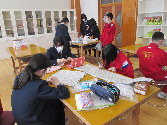 2022年02月24日(木) 全校生徒 2月22日(火)1年生の技術・家庭科の授業の様子をご紹介します。技術では,木材で棚を,家庭では,あずま袋を製作しています。お互いに教え合うなどあたたかい雰囲気で丁寧に作業を進めていました。完成が楽しみです!