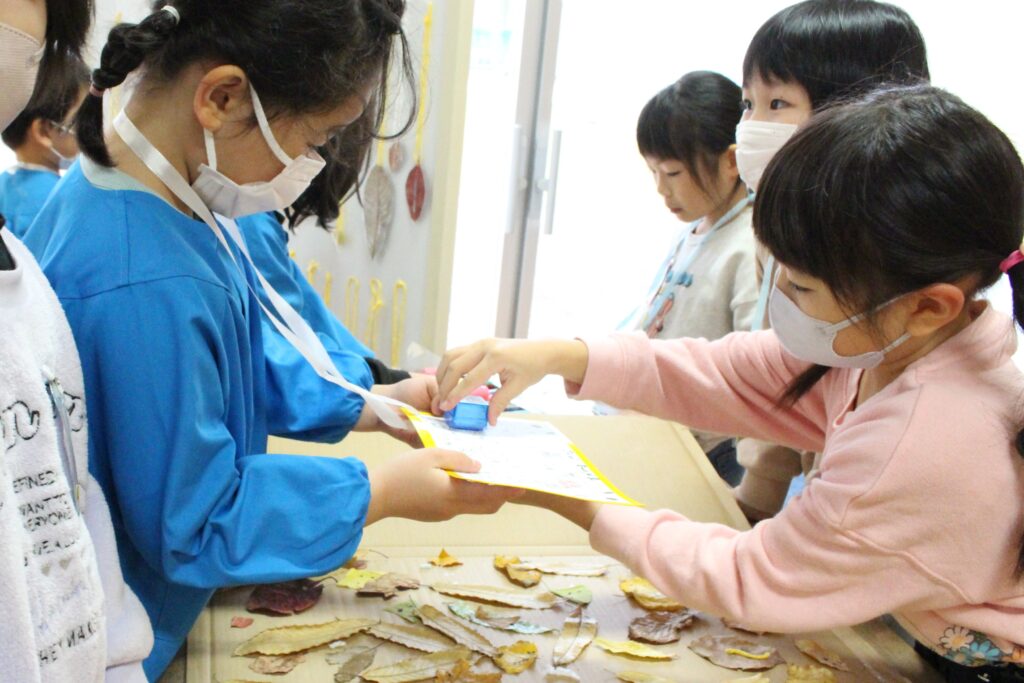 保育園の年長さんが遊びに来てくれました。ボウリングやクレーンゲームなど、1年生が準備した秋のおもちゃで一緒に遊びました。
