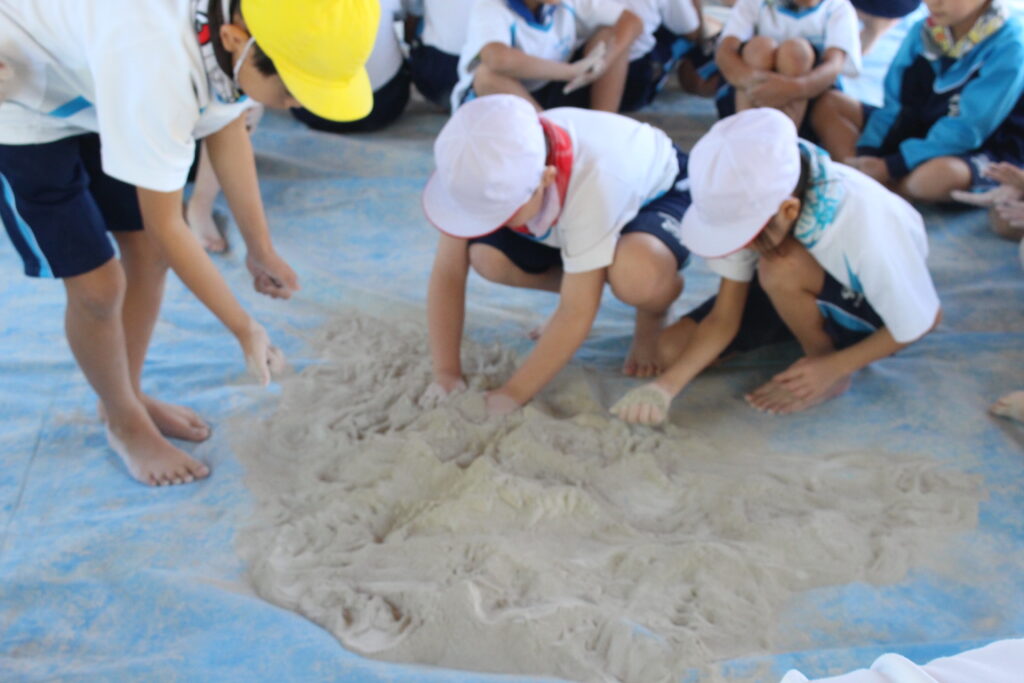 近代美術館を訪れ、屋外で「こなからねんどをつくろう」の学習活動を行いました。粉に水を少しずつ加えながら、粘土ができていく過程をじっくりと体験しました。