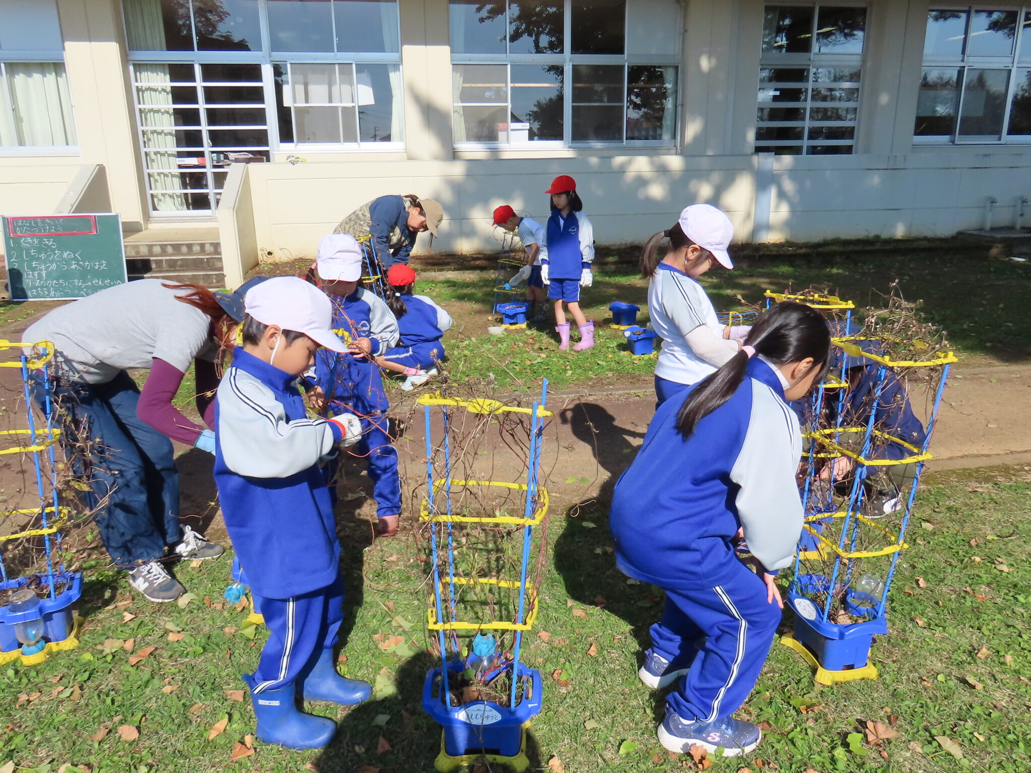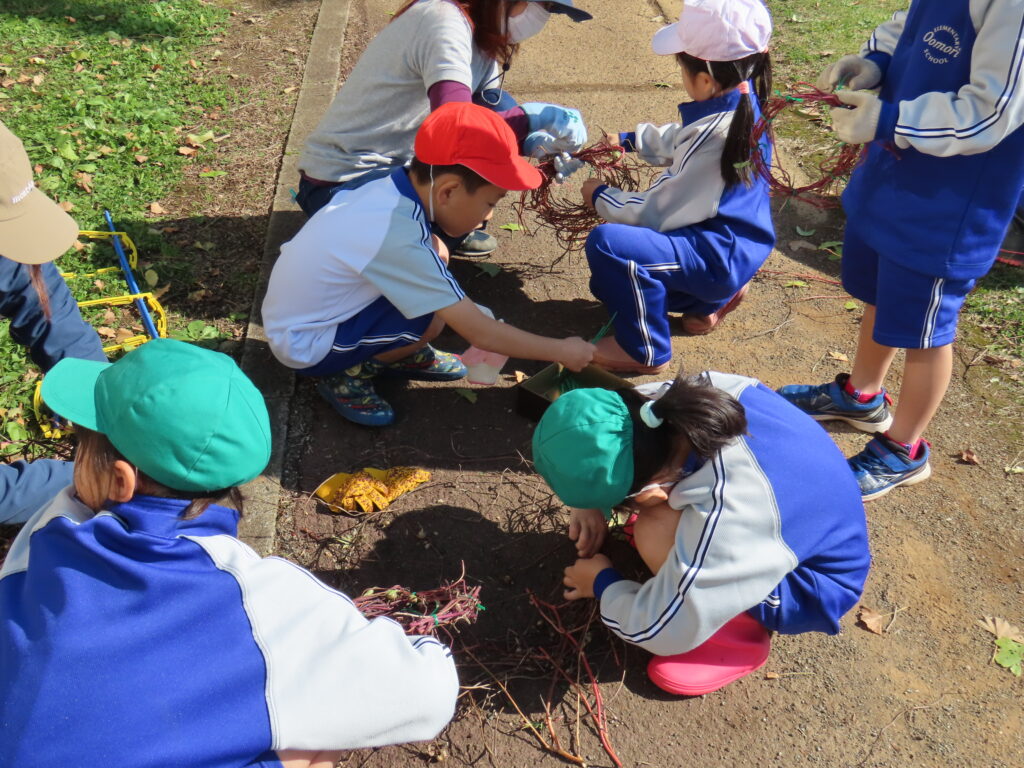 3、4校時目には1年生が自分たちで育てたアサガオのつるを使いリースづくりを行いました。つるが支柱にからまり外しにくかったですが、お手伝いに来てくださったボランティアの方々に助けてもらいながら上手にリースの形にすることができました!