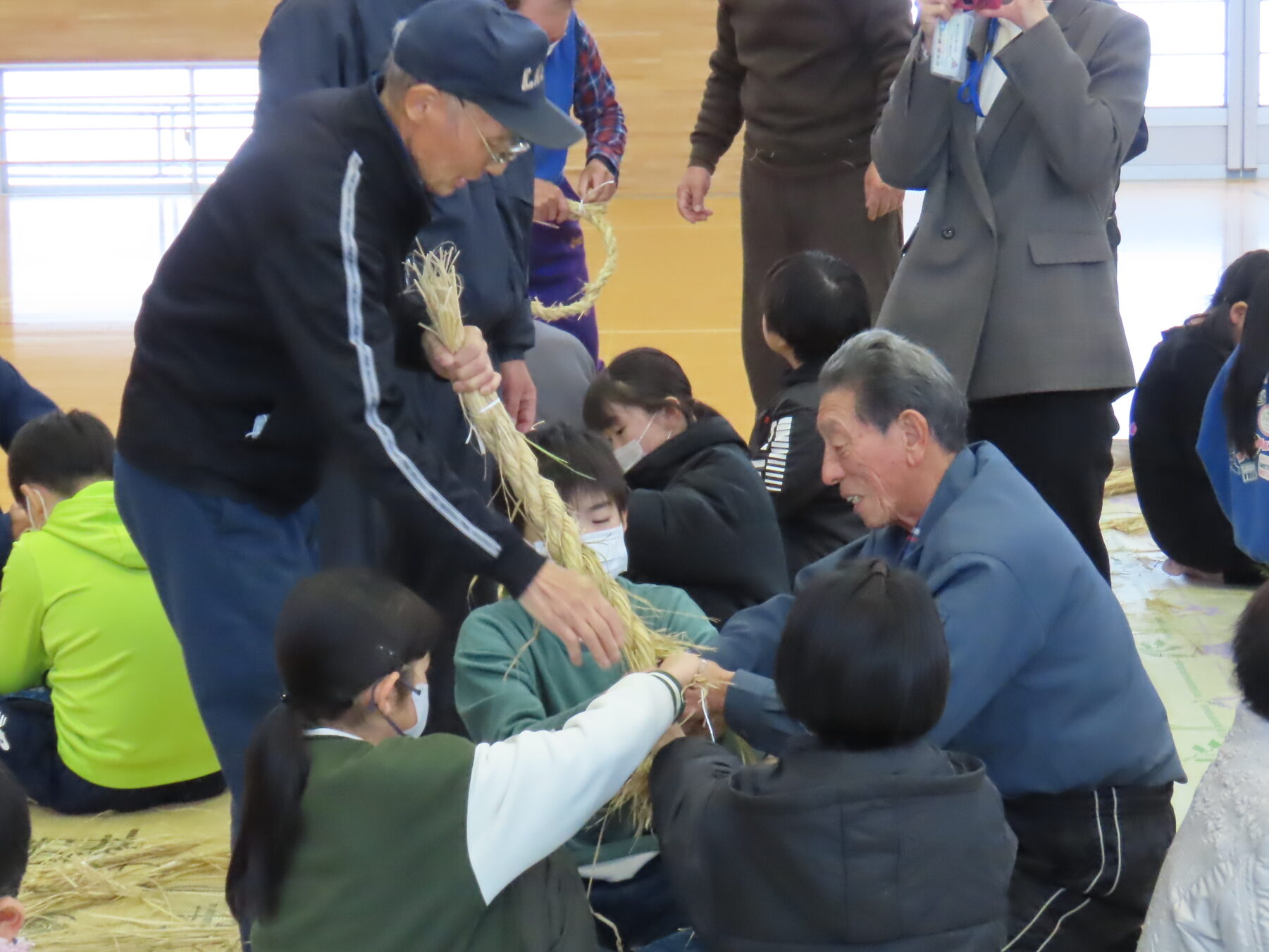12月12日、5年生が本校体育館で縄ない体験を行いました。約30名の地域の方が来てくださり、一緒にしめ飾りを作りました。子どもたちは初めての縄ないに苦戦していましたが、地域の方に教えてもらいながら自分だけのしめ飾りを完成させることができました。後半は、福祉施設に送る大きなしめ飾りをグループで協力して作り、地域の方と楽しく交流することができました!