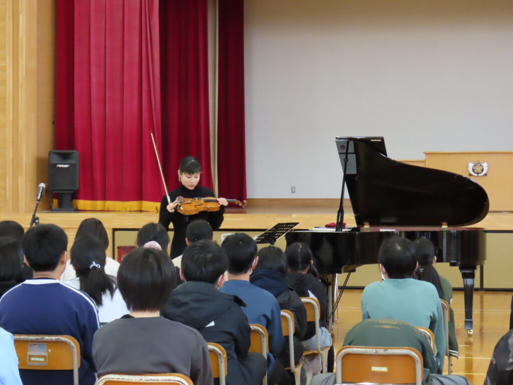 12月18日、ヴァイオリニストの石上真由子さんとピアニストの新居由佳梨さんをお迎えして、5・6年生が「おんかつ」を行いました。演奏の鑑賞はもちろん、ヴァイオリンやピアノの音の出る仕組み、奏法などを詳しく教えていただきました。プロの演奏を間近で聴くことができ、音楽への興味や理解が深まった貴重な経験になりました。