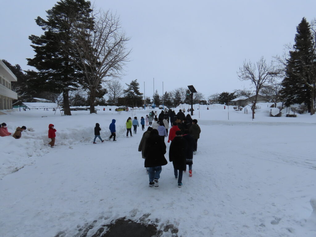 1月23日、冬に校内で火災が起きたことを想定した避難訓練を行いました。雪が積もっているため、普段とは違う経路で避難をしましたが、放送の指示に従って安全に避難することができました。非常事態発生時は冬でも外に避難しなければならない場合があります。この訓練を思い出してその時の状況に応じて避難をしましょう。