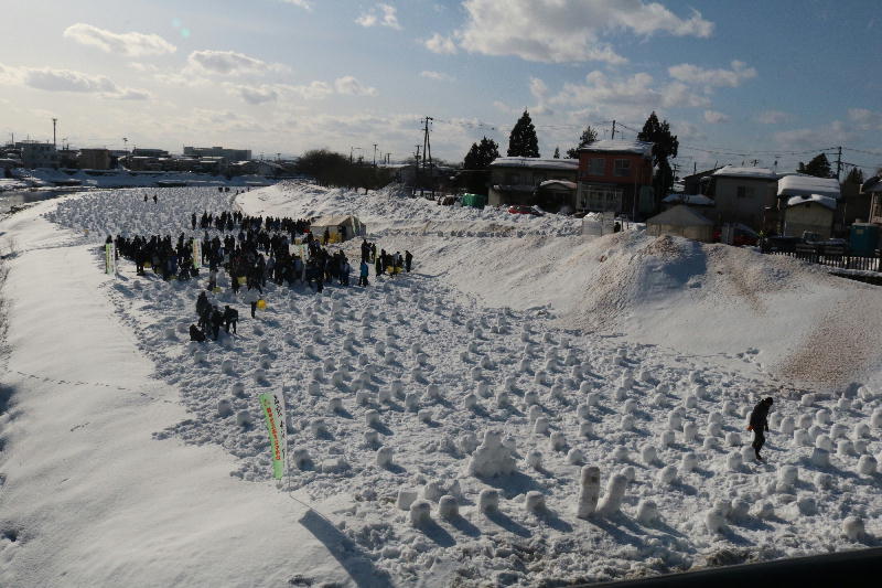 ○他の団体も含めて、蛇の崎川原には約3500個のミニかまくらが作られました。夜に点灯されたミニかまくらは幻想的な世界になります。