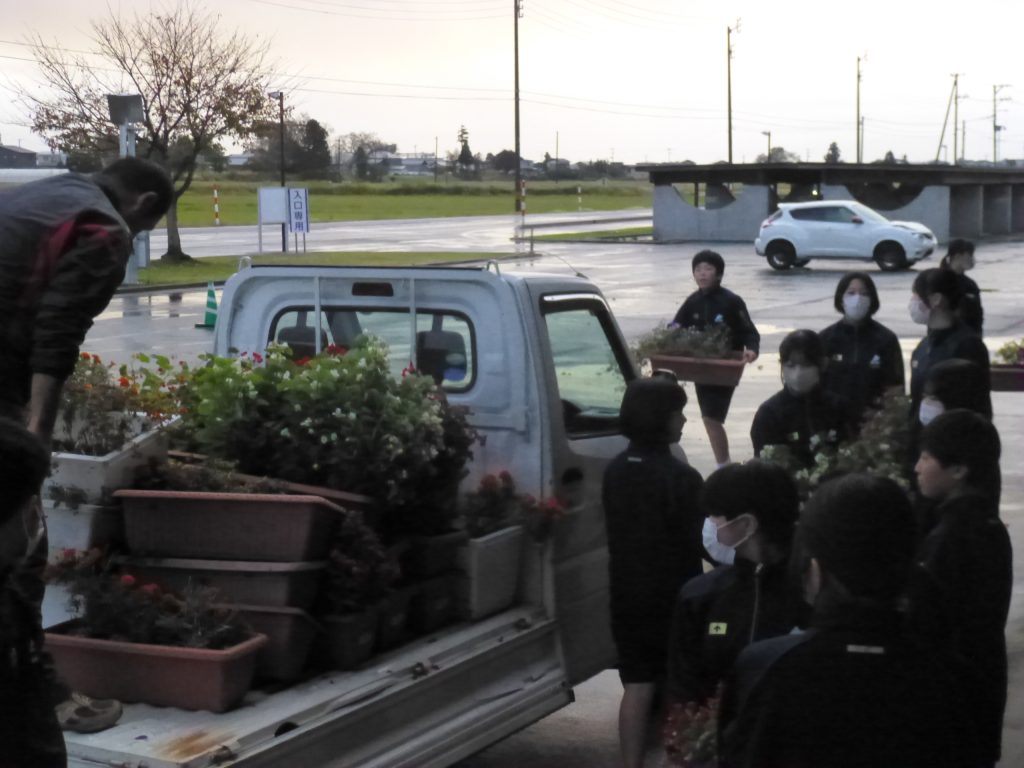 11月7日(木)、PTA環境整備委員と生徒会美化・福祉委員が合同で、玄関前のプランター撤去作業を行いました。小雨が降り寒い天気でしたが、協力して撤去作業を進めていました。これまで美化・福祉委員の生徒の皆さんや校務員さんが毎日水やりを頑張ってくれたおかげで、今日まできれいに咲いてくれました。玄関前の花がなくなり、いよいよ冬を迎えます。保護者の皆様、ご協力ありがとうございました。